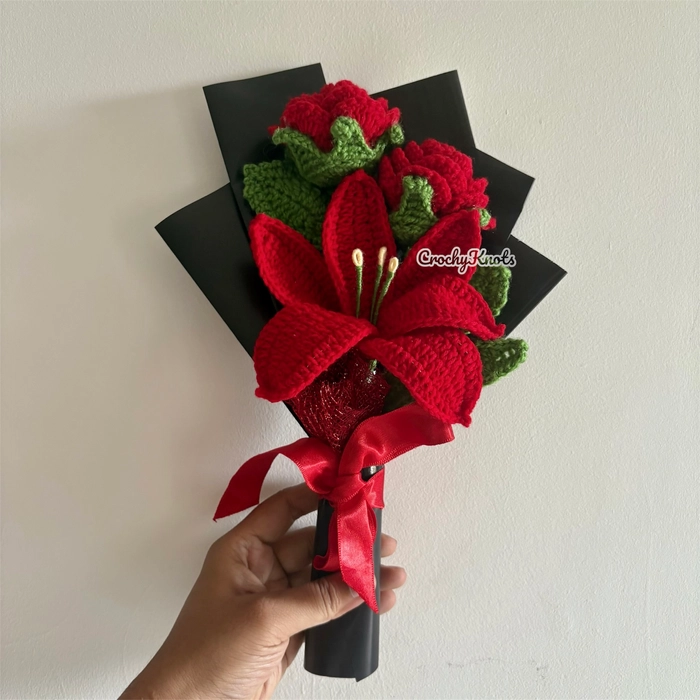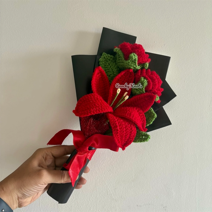 Meet Lover’s Lily — a handcrafted crochet bouquet that speaks the language of love. Featuring radiant red lily paired with two classic red roses, this bunch captures timeless romance in the softest stitches. Perfect for gifting, décor, or keeping a piece of love that never fades. 🌸❤️